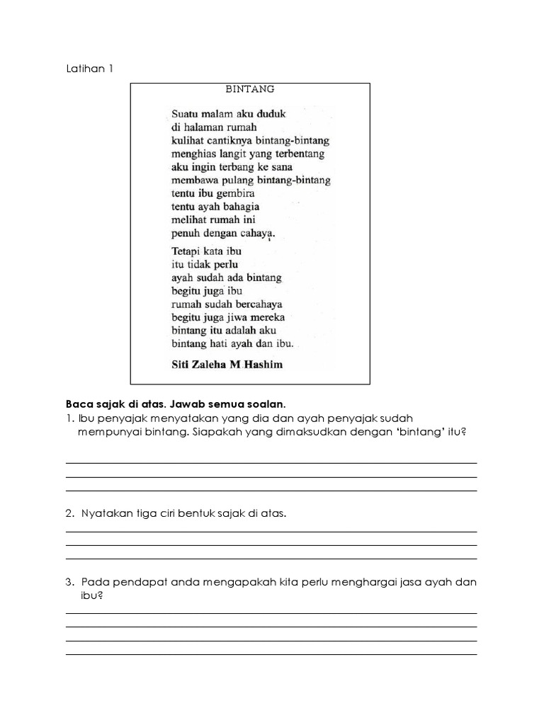 Komsas Soalan 2 D from cdn.slidesharecdn.com Terdiri daripada 4 rangkap yang tidak sama panjang, kecuali rangkap dua dan rangkap 3 yang mengandungi 5 baris setiap satunya. Beberapa contoh daripada komuniti kami. Maksud rangkap 1 pada suatu malam, penyajak duduk di halaman rumahnya sambil memerhatikan gugusan bintang di langit. Setiap rangkap mempunyai dua baris. Setiap umat manusia perlu bersabar menerima ketentuan tuhan walaupun hakikatnya terlalu sukar untuk dihadapi. Rangkap 2 penyajak menyusuri sepanjang pesisir pantai sambil membayangkan dirinya ialah nabi adam. Sajak bintang karya siti zaleha m. Atas kehendak tuhan dua orang saudara telah meninggal dunia.
